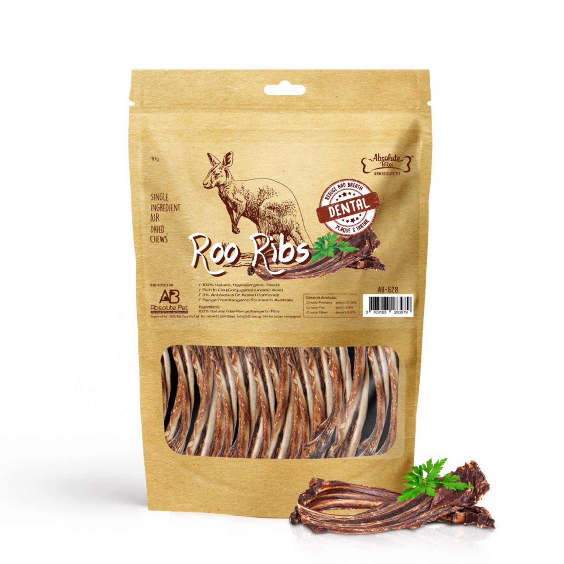 Introducing Absolute Bites Air Dried Kangaroo Ribs—an exquisite culinary masterpiece designed to be the highlight of your dog's snacking experience. Crafted with an unwavering commitment to quality, this treat is exclusively made from 100% natural free-range kangaroo sourced in Australia. Prepare your pup for a taste sensation that transcends the ordinary, delivering an explosion of flavors that captivates even the most discerning palate. Fortified with CLA (Conjugated linoleic acid) to bolster immune functions, packed with antioxidants, omega 3, and B12 vitamins—perfect for sensitive stomachs and allergies. Kangaroo, with less than 2% fat content, offers the least allergenic meat and nearly 5 times more antioxidants than any other treat.