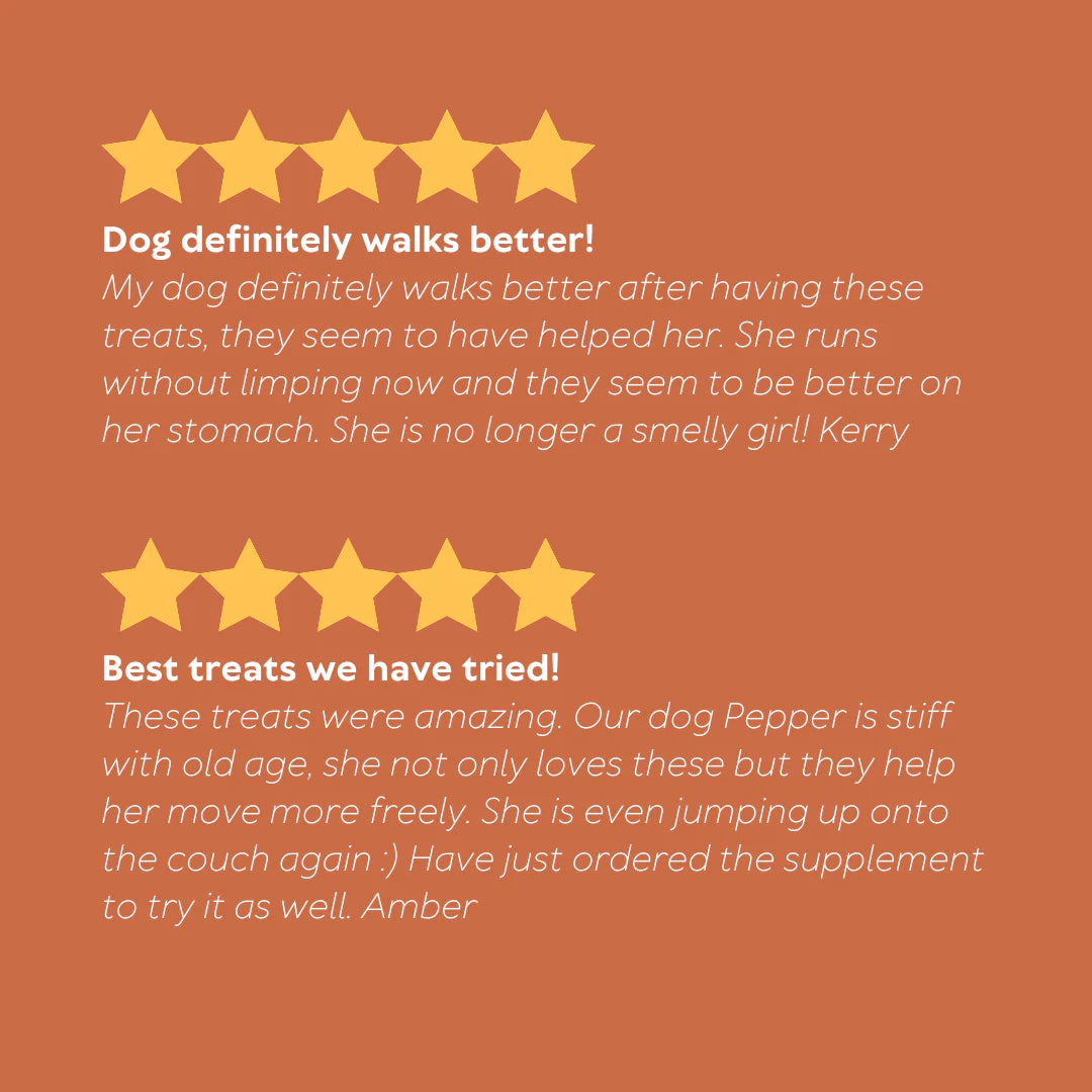 A natural treat containing a powerful combination of Rosehip and Turmeric powder together with our trademarked Supaw™ blend. Our Certified Organic Hip and Joint Treats help doggos with stiffness or inflammation or those prone to injury. They are a helpful recovery aid for active dogs, help with bone growth and mobility in younger dogs and ease stiffness, arthritis and other age-related joint pain in older dogs.