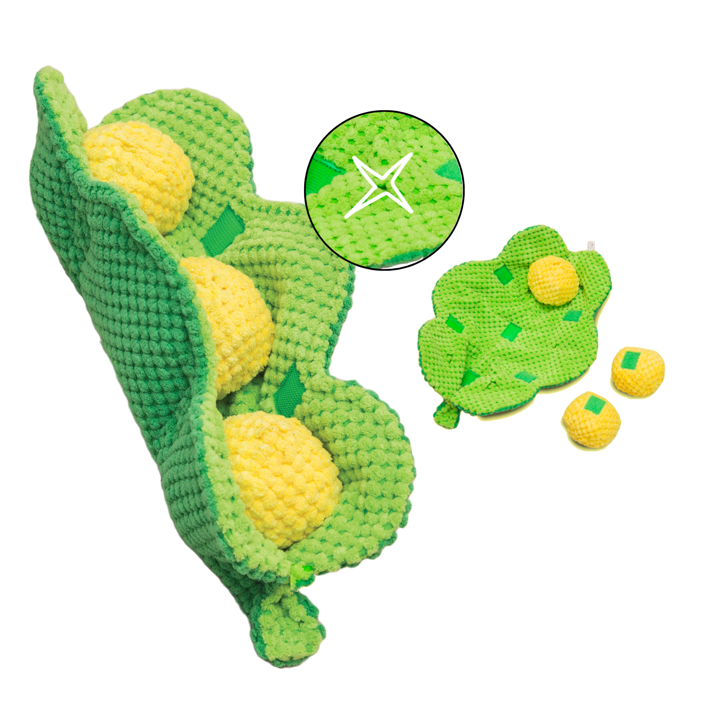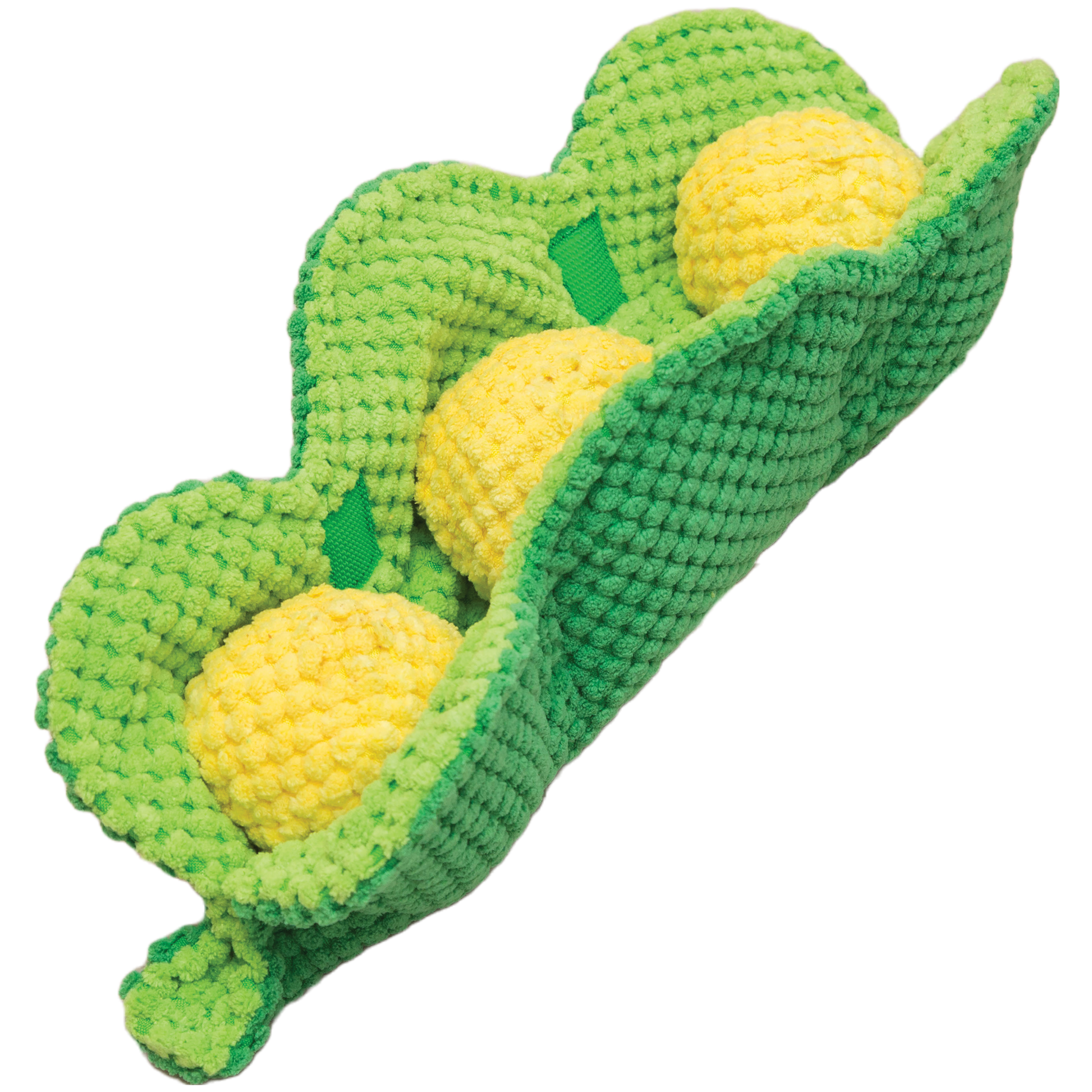 Pawty Peapod is an interactive plush toy for small and medium dogs. There are six slots in the pod and a slot in each pea.
