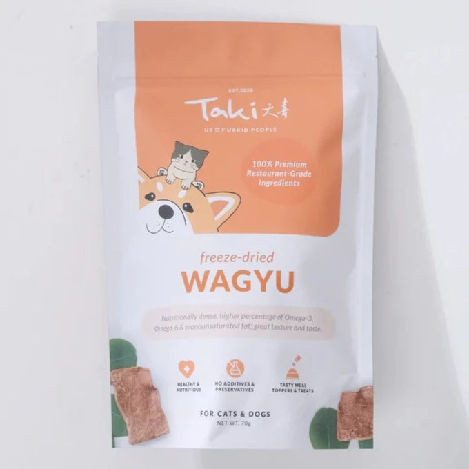 Wagyu beef contains a higher percentage of omega-3 and omega-6 fatty acids than other types of beef, and also has more monounsaturated fats.This soft fat has a low melting point, which creates a wonderful texture with lots of flavor. TAKI's wagyu sings directly to your furkid's primal heart.